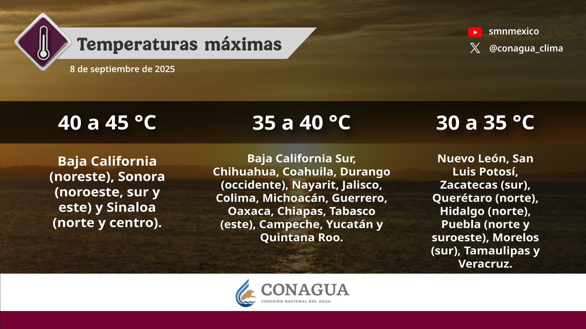 Continuará el ambiente de cálido a caluroso por las tardes en zonas del norte y centro de la República Mexicana, litoral del Pacífico y del golfo de México, además de la península de Yucatán, por lo que se esperan temperaturas máximas de 40 a 45 grados Celsius en Baja California (noreste), Sonora (noroeste, sur y este) y Sinaloa (norte y centro); de 35 a 40 grados en Baja California Sur, Chihuahua, Coahuila, Durango (occidente), Nayarit, Jalisco, Colima, Michoacán, Guerrero, Oaxaca, Chiapas, Tabasco (este), Campeche, Yucatán y Quintana Roo, y de 30 a 35 grados en Nuevo León, San Luis
