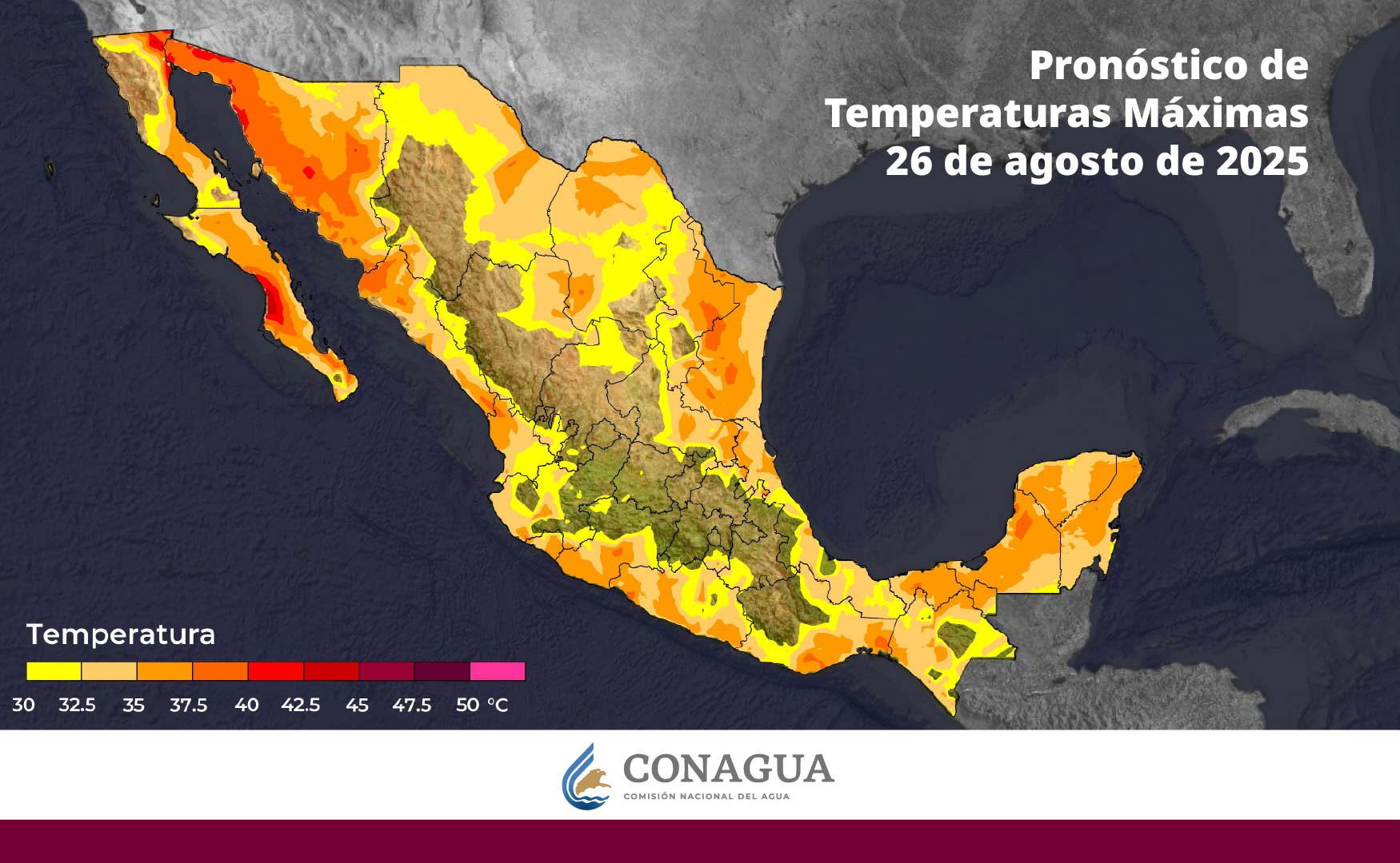 Se estiman temperaturas máximas de 40 a 45 grados Celsius en Baja California Sur y Sonora; de 35 a 40 grados en Chihuahua, Sinaloa, Coahuila, Nuevo León, Tamaulipas, San Luis Potosí, Durango, Nayarit, Jalisco, Colima, Michoacán, Guerrero, Oaxaca, Chiapas, Veracruz, Tabasco, Campeche, Yucatán y Quintana Roo, y de 30 a 35 grados en Zacatecas (norte y sur), Querétaro (norte), Hidalgo (norte), Puebla (norte y suroeste) y Morelos.