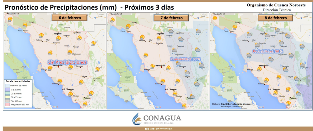 Hermosillo, Sonora; 6 de febrero de 2026.– La Coordinación Estatal de Protección Civil (CEPC) en Sonora informó que hay posibilidades de lluvias ligeras en la entidad, durante este fin de semana.
