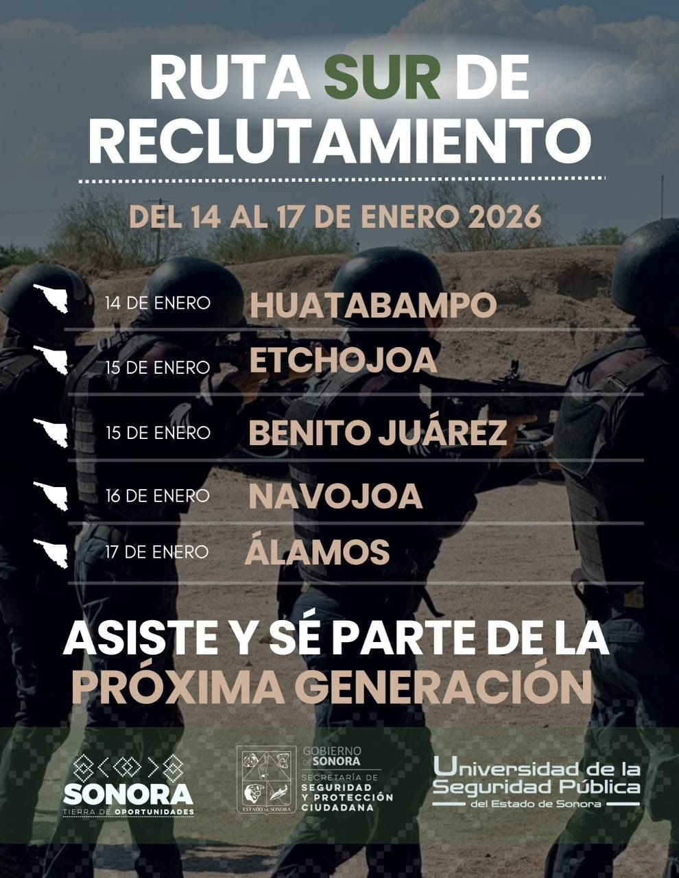 Hermosillo, Sonora; 12 de enero de 2026.- Con el objetivo de convocar a jóvenes sonorenses a formarse como Policía de Proximidad, la Universidad de la Seguridad Pública (USP) iniciará la ruta de reclutamiento 2026 en municipios del sur de la entidad, informó Ellioth Romero Grijalva.