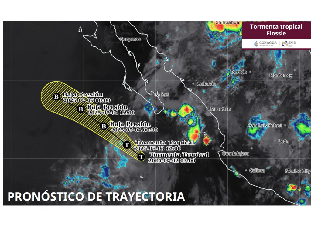 La madrugada de hoy, Flossie se debilitó a tormenta tropical al sur-suroeste de Cabo San Lucas, Baja California Sur, y a las 06:00 horas, tiempo del centro de México, el centro del sistema se localizó aproximadamente a 310 kilómetros (km) al sur-suroeste de la misma localidad, con vientos máximos sostenidos de 95 km/h, rachas de 110 km/h y desplazamiento hacia el oeste-noroeste a 15 km/h; aun cuando el sistema seguirá perdiendo fuerza durante este día, mantendrá chubascos, rachas fuertes de viento y oleaje elevado en la costa sur de Baja California Sur, mientras se aleja gradualmente de las costas nacionales.