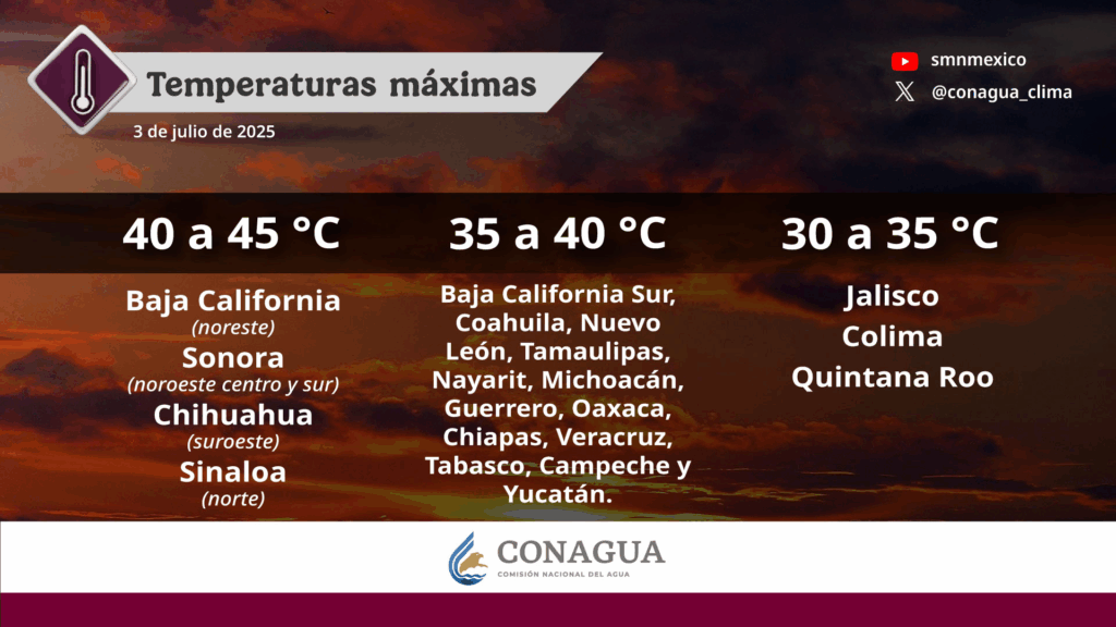 Finalmente, se mantendrá el ambiente de caluroso a muy caluroso en entidades del noroeste y norte del territorio mexicano, además de la península de Yucatán; se pronostican temperaturas máximas de 40 a 45 grados Celsius en Baja California (noreste), Sonora (noroeste, centro y sur), Chihuahua (suroeste) y Sinaloa (norte); de 35 a 40 grados en Baja California Sur, Coahuila, Nuevo León, Tamaulipas, Nayarit, Michoacán, Guerrero, Oaxaca, Chiapas, Veracruz, Tabasco, Campeche y Yucatán, y de 30 a 35 grados Jalisco, Colima y Quintana Roo.