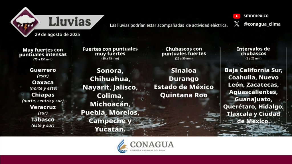 El pronóstico del tiempo para hoy, viernes, es de lluvias intensas (de 75 a 150 milímetros [mm]) para el este de Guerrero, norte y este de Oaxaca, norte, centro y sur de Chiapas, sur de Veracruz y el este y sur de Tabasco; muy fuertes (de 50 a 75 mm) en Sonora, Chihuahua, Nayarit, Jalisco, Colima, Michoacán, Puebla, Morelos, Campeche y Yucatán; fuertes (de 25 a 50 mm) para Sinaloa, Durango, Estado de México y Quintana Roo; chubascos (de 5 a 25 mm) en Baja California Sur, Coahuila, Nuevo León, Zacatecas, Aguascalientes, Guanajuato, Querétaro, Hidalgo, Tlaxcala y Ciudad de México, y lluvias