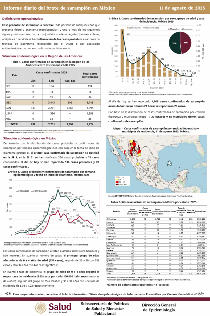 La Secretaría de Salud federal confirmó un total de cuatro mil seis contagios y 14 defunciones por sarampión.