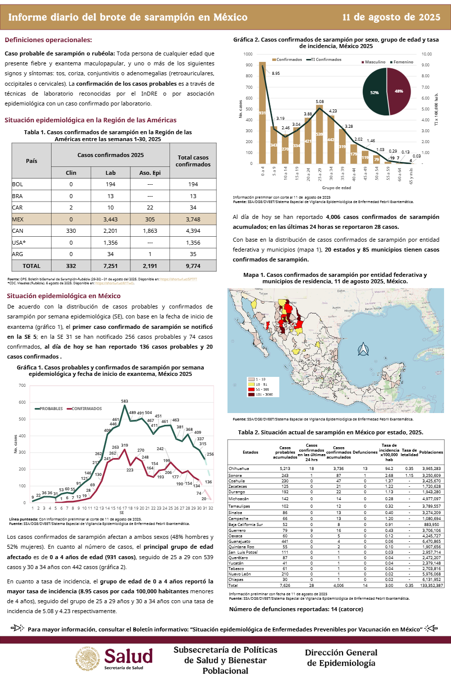 Los casos confirmados de sarampión afectan a ambos sexos (48% hombres y 52% mujeres). En cuanto al número de casos, el principal grupo de edad afectado es de 0 a 4 años de edad (931 casos), seguido de 25 a 29 con 539 casos y 30 a 34 años con 442 casos.