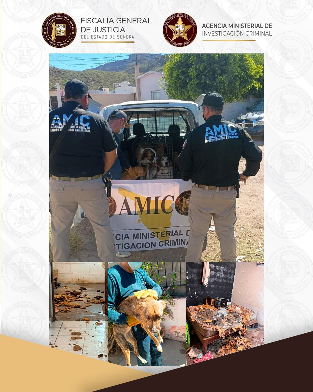 Guaymas, Son.-Como resultado de una diligencia de cateo autorizada por un Juez, la Agencia Ministerial de Investigación Criminal (AMIC) ejecutó una intervención en un domicilio en Guaymas, donde fueron localizados siete caninos abandonados, iniciándose las investigaciones correspondientes por el delito de maltrato animal.