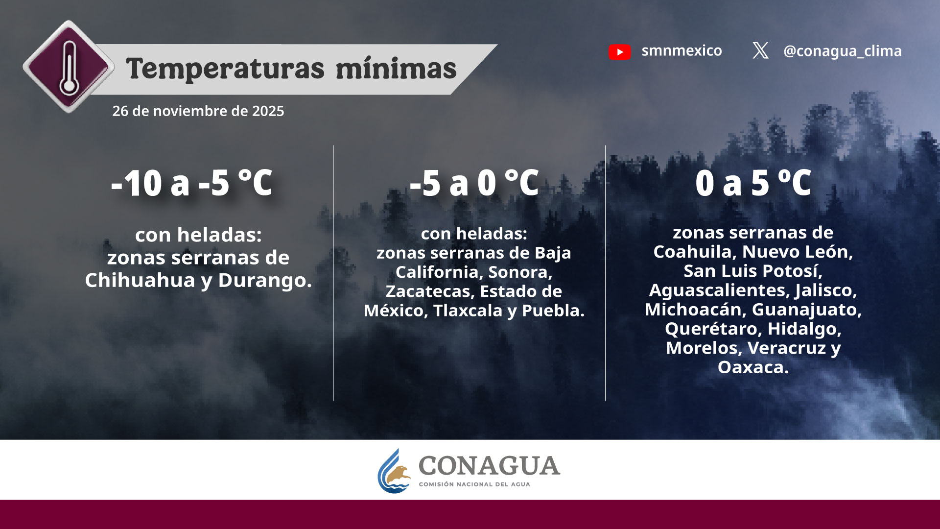 Durante la mañana, se prevén temperaturas mínimas de -10 a -5 grados Celsius con heladas en zonas altas de Chihuahua y Durango; de -5 a 0 grados con heladas en zonas serranas de Baja California, Sonora, Zacatecas, Estado de México, Tlaxcala y Puebla, y de 0 a 5 en zonas montañosas de Coahuila, Nuevo León, San Luis Potosí, Aguascalientes, Jalisco, Michoacán, Guanajuato, Querétaro, Hidalgo, Morelos, Veracruz y Oaxaca.