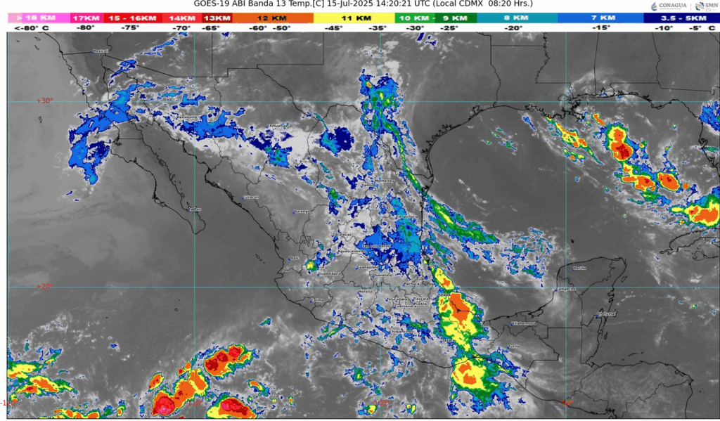 Para este martes, se pronostican lluvias puntuales intensas (de 75 a 50 milímetros [mm]) en Guerrero (sureste) y Oaxaca (oeste); muy fuertes (de 50 a 75 mm) en Sonora, Chihuahua, Coahuila, Jalisco, Michoacán, Guanajuato, Estado de México y Ciudad de México; fuertes (de 25 a 50 mm) en Durango, Sinaloa, Colima, Nuevo León, San Luis Potosí, Zacatecas, Aguascalientes, Querétaro, Hidalgo, Puebla, Tlaxcala, Morelos, Chiapas, Yucatán y Quintana Roo; chubascos (de 5 a 25 mm) en Nayarit, Tamaulipas, Veracruz y Campeche, así como aisladas (de 0.1 a 5 mm) en Baja California Sur y Tabasco.