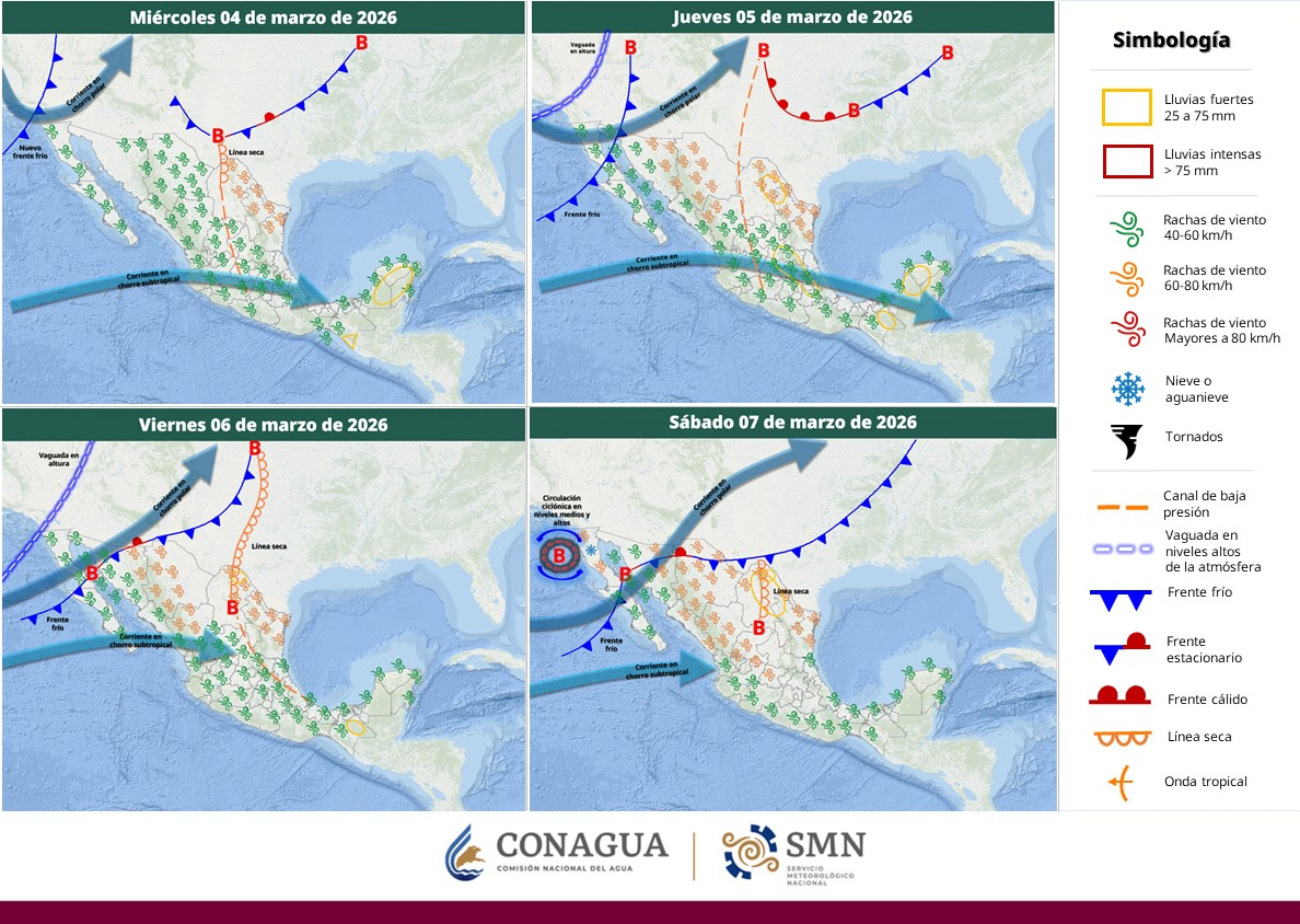 Por otra parte, se prevén rachas de viento de 50 a 70 kilómetros por hora (km/h) en regiones de Tamaulipas y con posibles torbellinos en Coahuila, Nuevo León; rachas de 40 a 60 km/h en zonas de Sonora, Chihuahua, Durango, Campeche, Yucatán, istmo y golfo de Tehuantepec (Oaxaca y Chiapas), y rachas de 30 a 50 km/h en Baja California, Baja California Sur, Sinaloa, Nayarit, Jalisco, Michoacán, Guerrero, Zacatecas, Aguascalientes, San Luis Potosí, Guanajuato, Querétaro, Hidalgo, Puebla, Tlaxcala, Estado de México, Ciudad de México, Tabasco y Quintana Roo, además de oleaje de 1.0 a 2.0 metros de altura en la costa occidental de la península de Baja California y, durante la mañana, en el golfo de Tehuantepec.