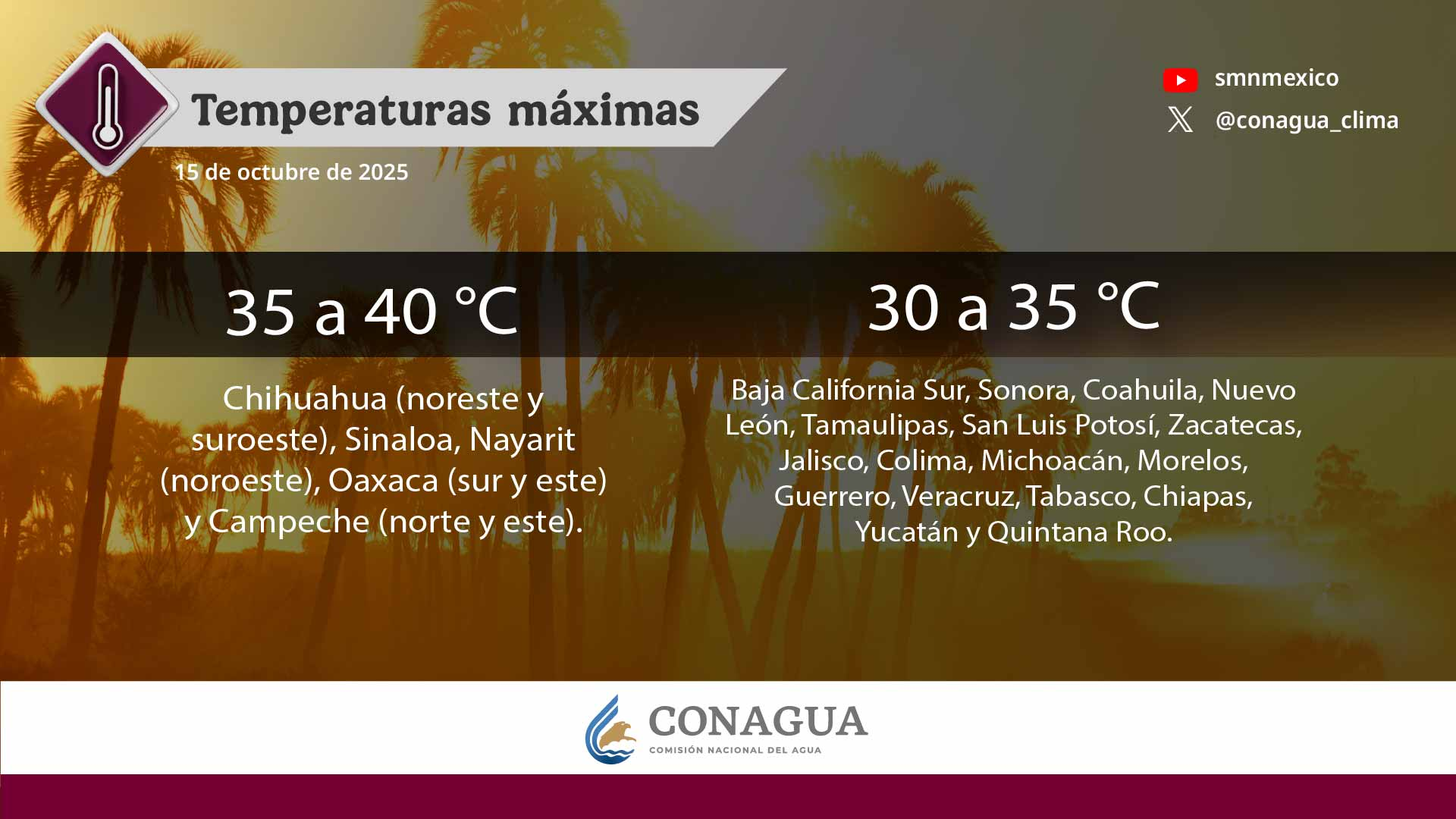 Hacia la tarde, las temperaturas máximas serán de 35 a 40 grados Celsius en Sinaloa, el noreste y suroeste de Chihuahua, noroeste de Nayarit, sur y este de Oaxaca y el norte y este de Campeche, y de 30 a 35 grados Celsius en Baja California Sur, Sonora, Coahuila, Nuevo León, Tamaulipas, San Luis Potosí, Zacatecas, Jalisco, Colima, Michoacán, Morelos, Guerrero, Veracruz, Tabasco, Chiapas, Yucatán y Quintana Roo.