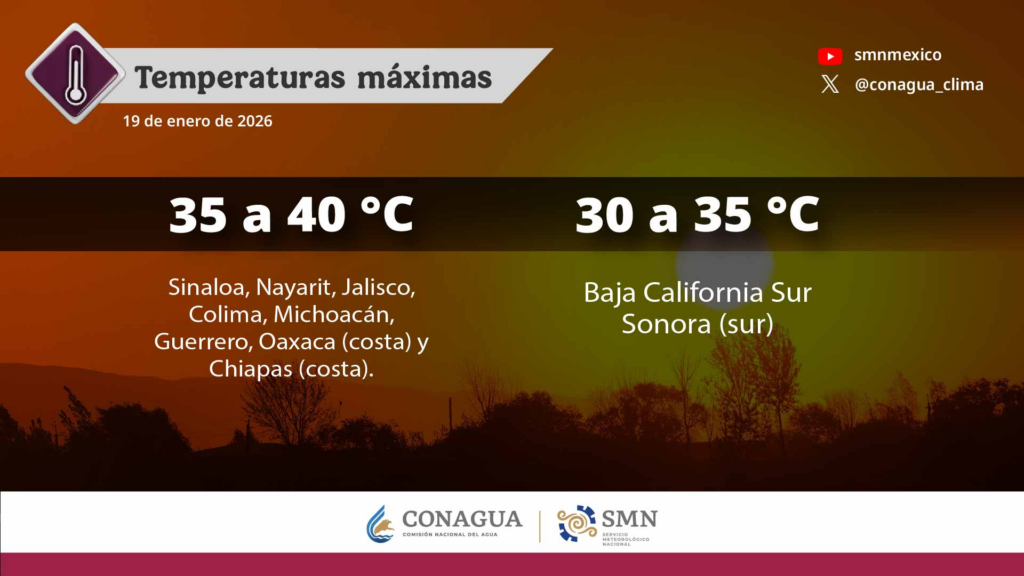 Finalmente, se prevén temperaturas máximas de 35 a 40 grados Celsius en Sinaloa, Nayarit, Jalisco, Colima, Michoacán, Guerrero, Oaxaca (costa) y Chiapas (costa), y de 30 a 35 grados en Baja California Sur y Sonora (sur).