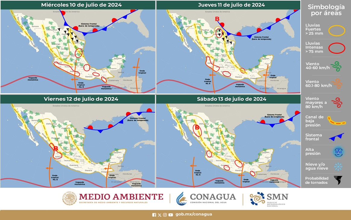 Lo anteriormente mencionado se originará por el desplazamiento de la onda tropical número 8 sobre el centro, sur y occidente de la República Mexicana, así como por canales de baja presión sobre las sierras Madre Occidental y Madre Oriental, la península de Yucatán y el sureste mexicano, en interacción con inestabilidad en niveles altos de la atmósfera y el ingreso de humedad procedente del océano Pacífico y golfo de México.