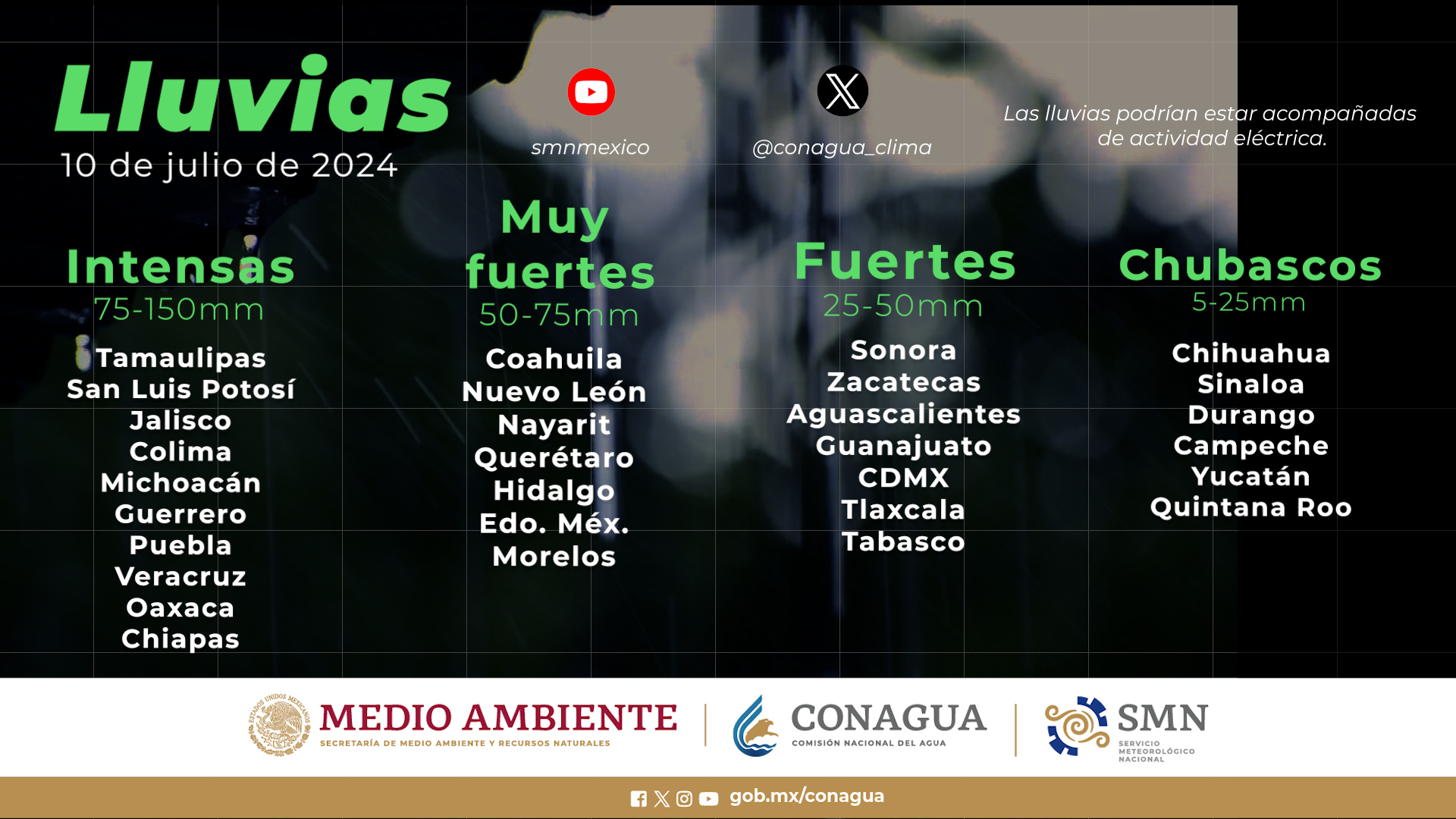 Se esperan lluvias puntuales intensas (de 75 a 150 milímetros [mm]) en Chiapas, Colima, Guerrero, Jalisco, Michoacán, Oaxaca, Puebla, San Luis Potosí, Tamaulipas y Veracruz; muy fuertes (de 50 a 75 mm) en Coahuila, Estado de México, Hidalgo, Morelos, Nayarit, Nuevo León y Querétaro; fuertes (de 25 a 50 mm) en Aguascalientes, Ciudad de México, Guanajuato, Sonora, Tabasco, Tlaxcala y Zacatecas; intervalos de chubascos (de 5 a 25 mm) en Campeche, Chihuahua, Durango, Quintana Roo, Sinaloa, Yucatán, así como lluvias aisladas (de 0.1 a 5 mm) en Baja California.