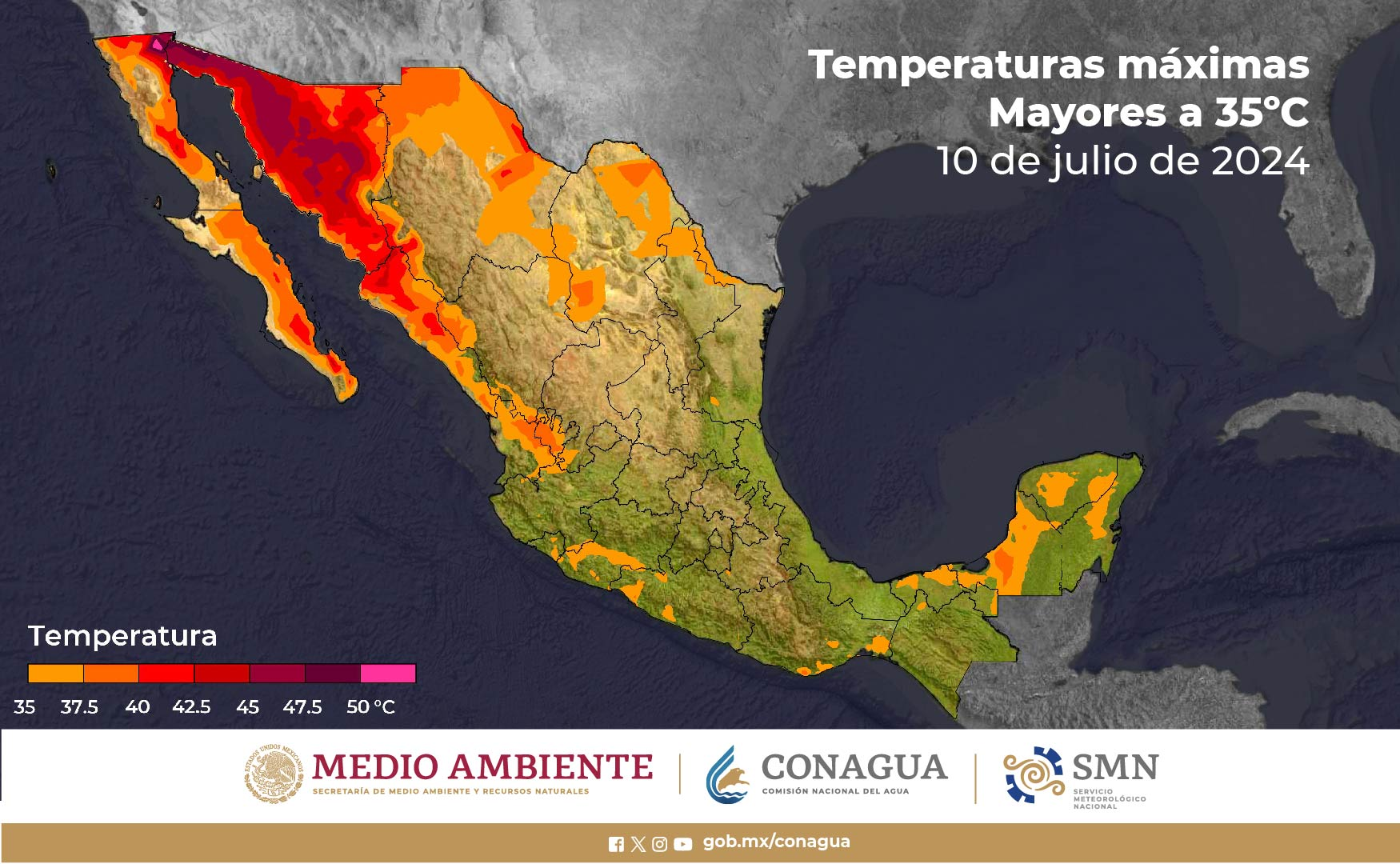 En contraste, se prevén temperaturas máximas superiores a 45 grados Celsius en Baja California y Sonora; de 40 a 45 grados en Baja California Sur, Chihuahua y Sinaloa; de 35 a 40 grados en Campeche, Coahuila, Nuevo León, Tamaulipas y Yucatán, y de 30 a 35 grados en Colima, Durango, Jalisco, Nayarit, Oaxaca, Quintana Roo, Tabasco y Veracruz.