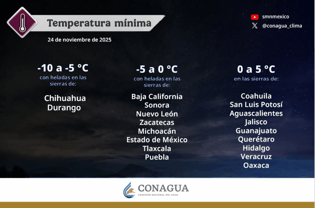 Para el amanecer de hoy, se pronosticaron temperaturas mínimas de -10 a -5 grados Celsius con heladas en las sierras de Chihuahua y Durango; de -5 a 0 grados y heladas en las montañas de Baja California, Sonora, Nuevo León, Zacatecas, Michoacán, Estado de México, Tlaxcala y Puebla, y de 0 a 5 grados en zonas serranas de Coahuila, San Luis Potosí, Aguascalientes, Jalisco, Guanajuato, Querétaro, Hidalgo, Veracruz y Oaxaca.