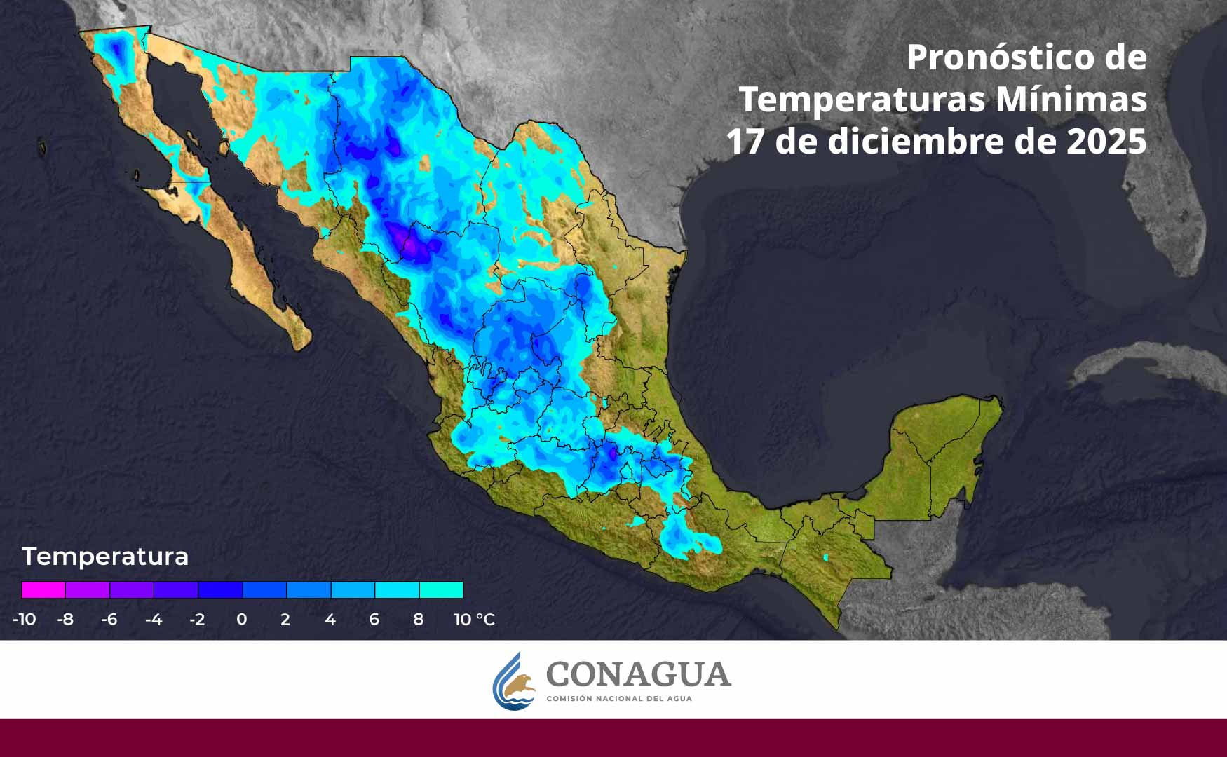 Por otro lado, se mantendrá el ambiente de frío a muy frío durante la mañana y noche sobre entidades de la Mesa del Norte y la Mesa Central con temperaturas mínimas de -10 a -5 grados Celsius con heladas en zonas serranas de Chihuahua y Durango; de -5 a 0 grados con heladas en zonas altas de Baja California, Sonora, Zacatecas, Estado de México, Tlaxcala y Puebla y de 0 a 5 grados en zonas altas de Coahuila, Nuevo León, San Luis Potosí, Aguascalientes, Jalisco, Michoacán, Guanajuato, Querétaro, Hidalgo, Veracruz y Oaxaca.