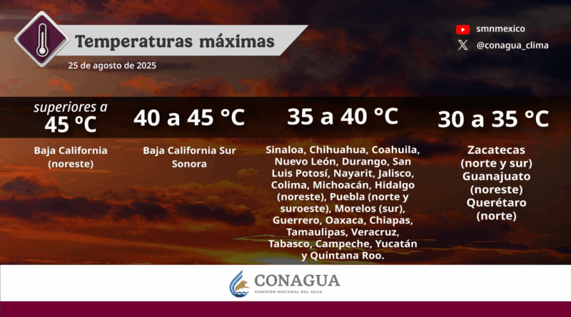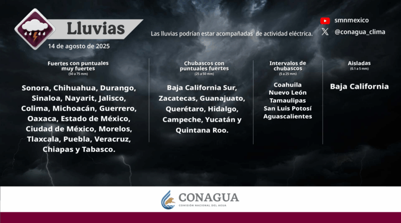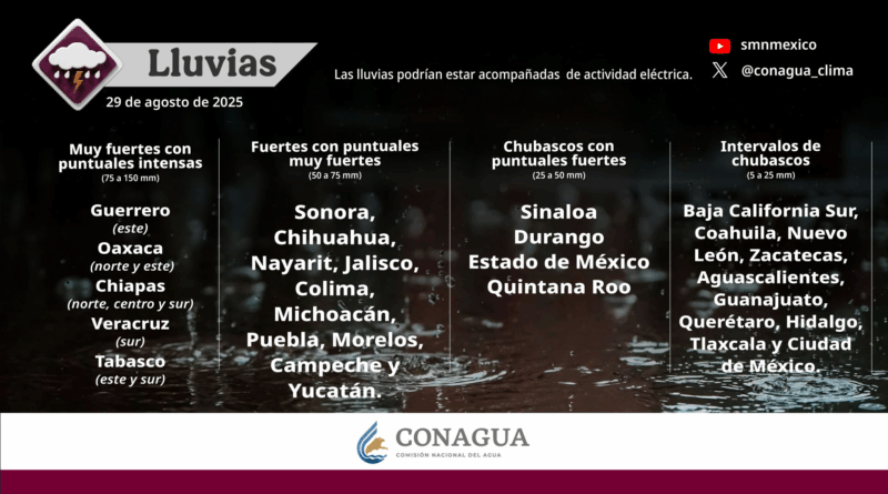 Read MoreDurante este día, se esperan lluvias muy fuertes (de 50 a 75 milímetros [mm]) en Sonora, Chihuahua, Durango, Sinaloa, Nayarit,