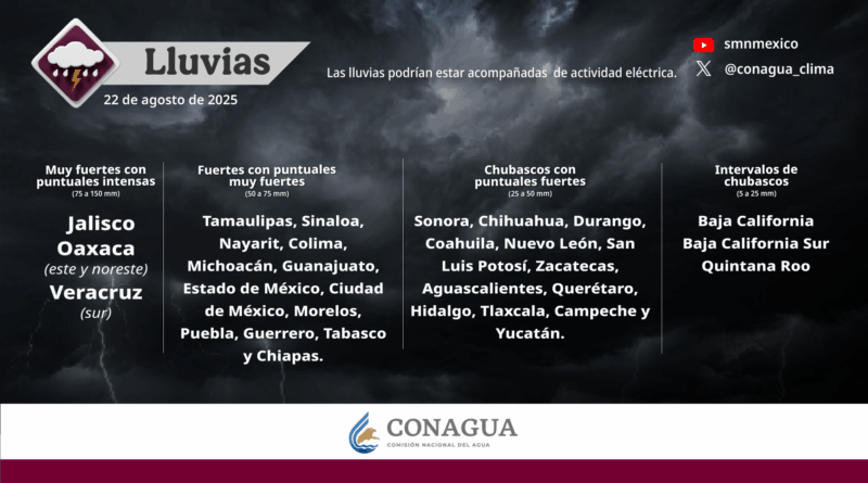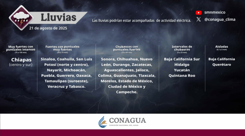 Read MoreHoy, se pronostican lluvias puntuales intensas (de 75 a 150 milímetros [mm]) en Chiapas (centro y sur); muy fuertes (de