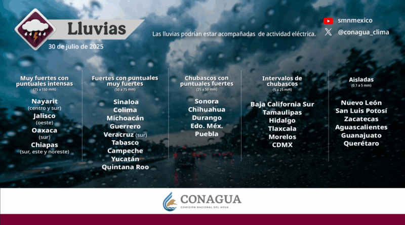 Read MorePara este jueves, se pronostican lluvias puntuales muy fuertes (de 50 a 75 milímetros [mm]) en Michoacán, Guerrero y Oaxaca;