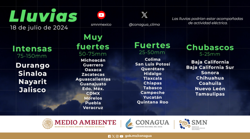 Read MoreSe esperan lluvias puntuales intensas (de 75 a 150 milímetros [mm]) en Chiapas, Durango, Guerrero, Jalisco, Nayarit, Oaxaca, Puebla, Sinaloa,