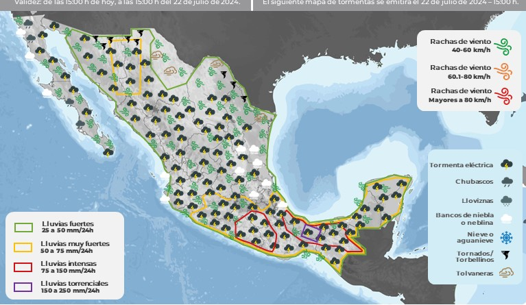 Para este miércoles se pronostican lluvias puntuales intensas (de 75 a 150 mm) en regiones de Durango, Estado de México, Jalisco,