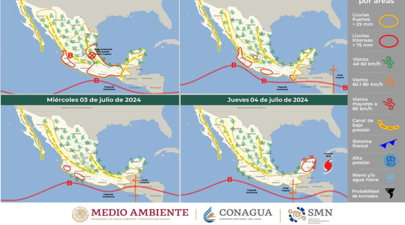Para este miércoles, se pronostican lluvias puntuales torrenciales (de 150 a 250 milímetros [mm]) en Guerrero (oriente), Oaxaca y Chiapas;